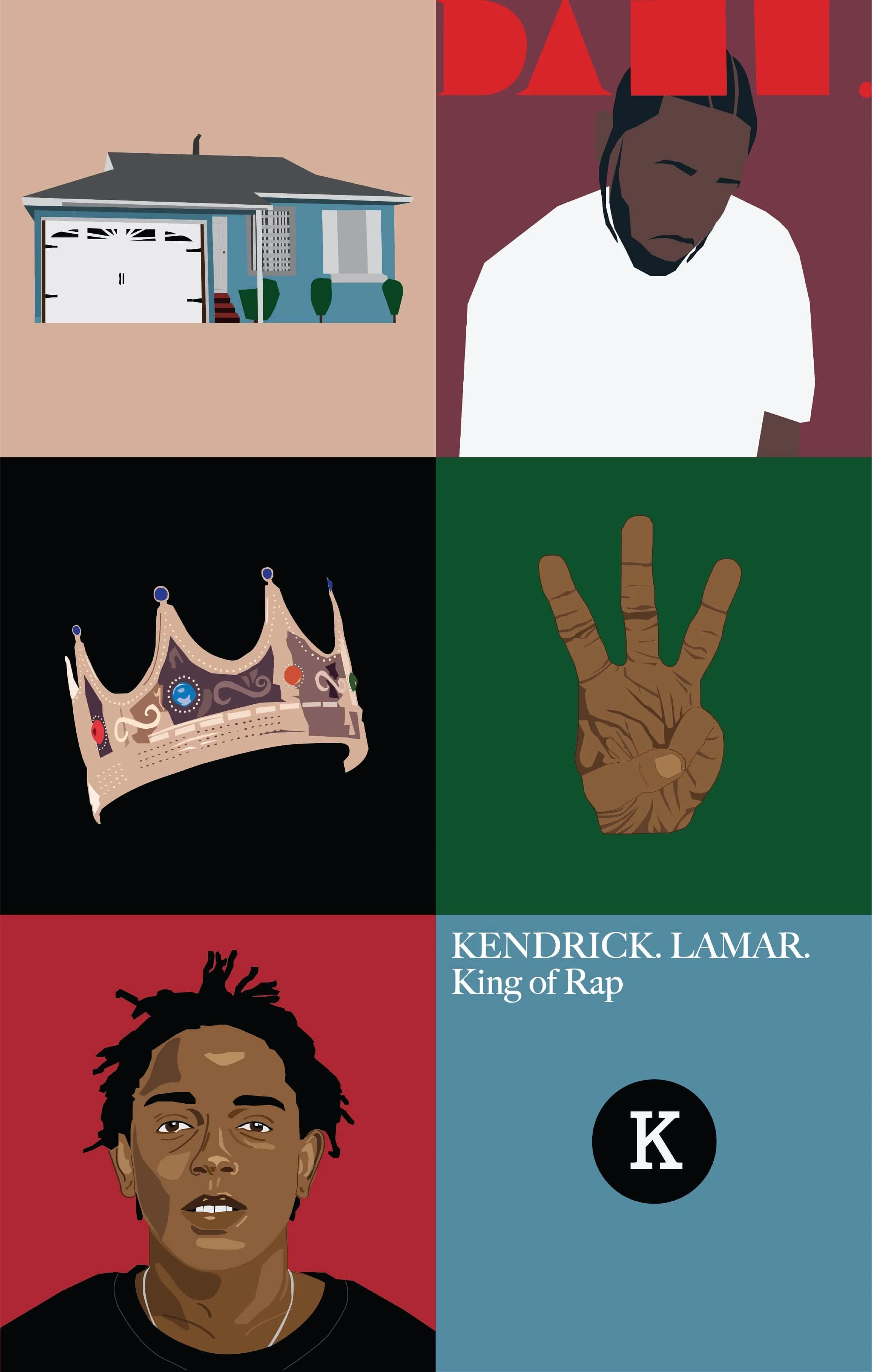 The bottom right square has his name, title, and the letter “K” inside of a black dot, nodding to his stage name when he first began his career, K.Dot.