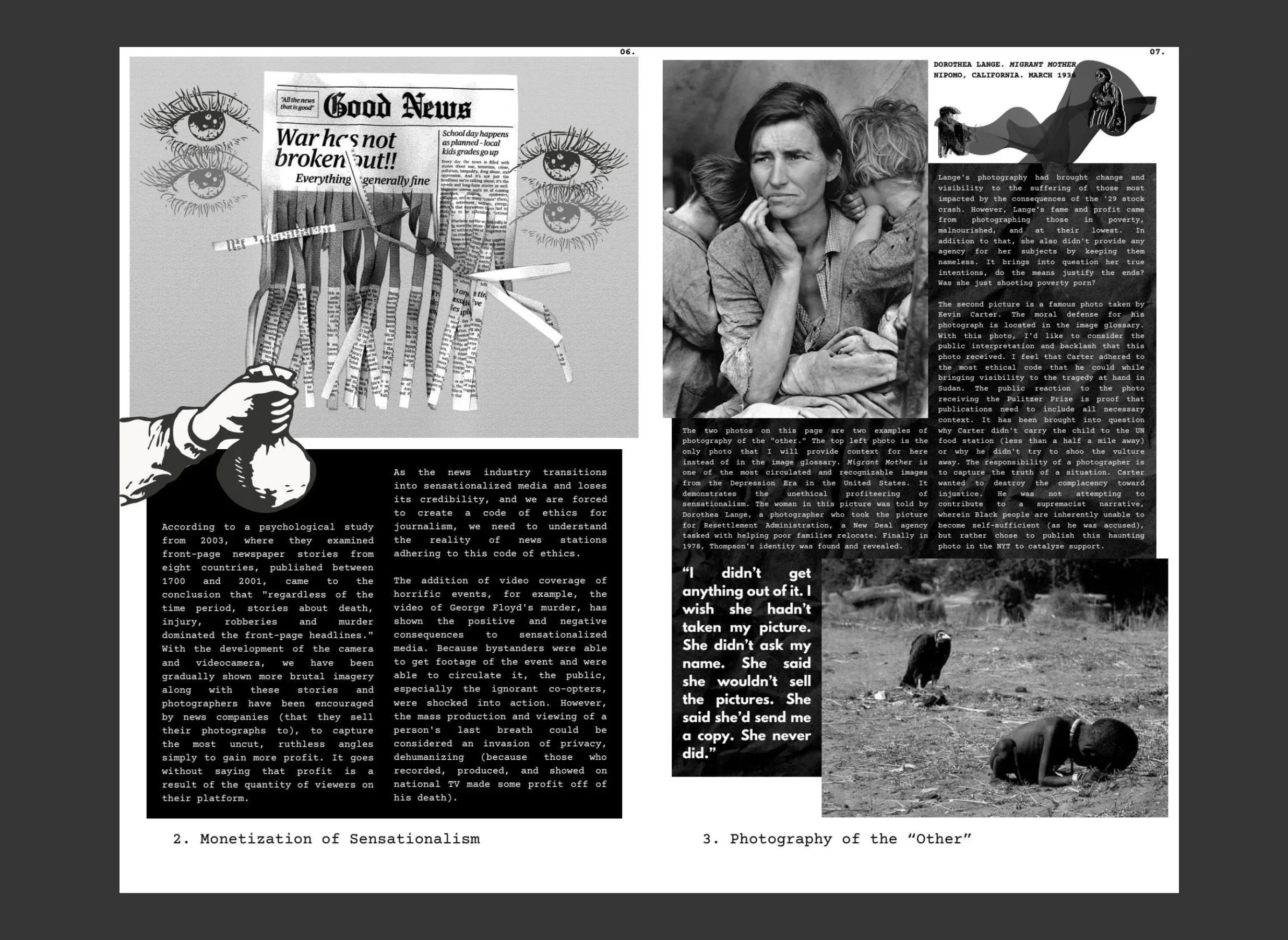 In Prof. Foley’s Ethical Issues in Media class, I designed and wrote text for a zine on brutal imagery in photojournalism. In this zine, I expound upon the idea of a code of ethics for photojournalism, question the ethicality & impact of certain famous photos, and showcase the effect of context with/out pictures.